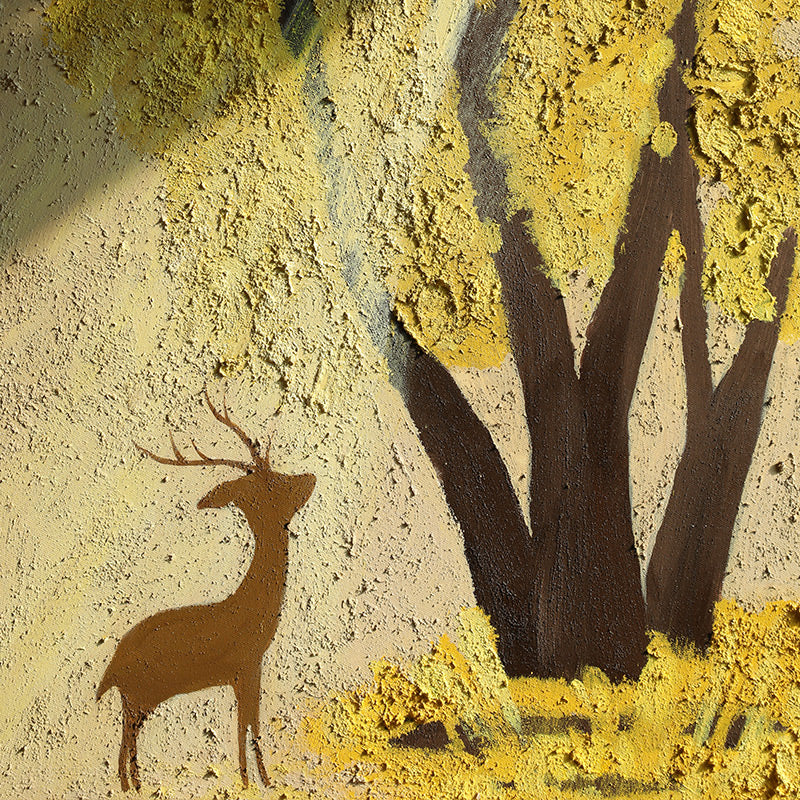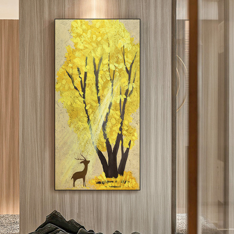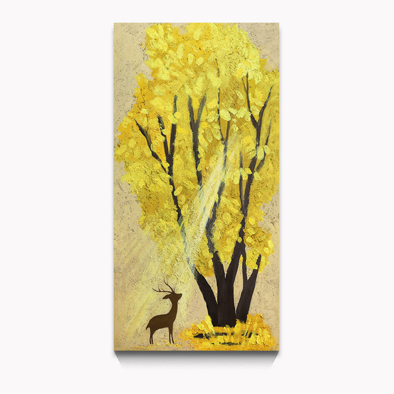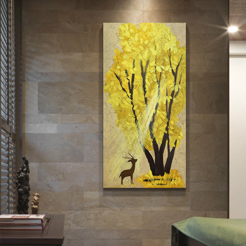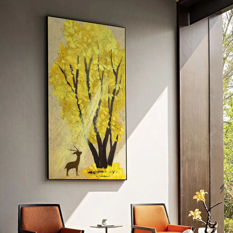 A Deer Near the Gold Tree, Original Handmade Landscape Painting for Wall Decor, Modern Art on Canvas