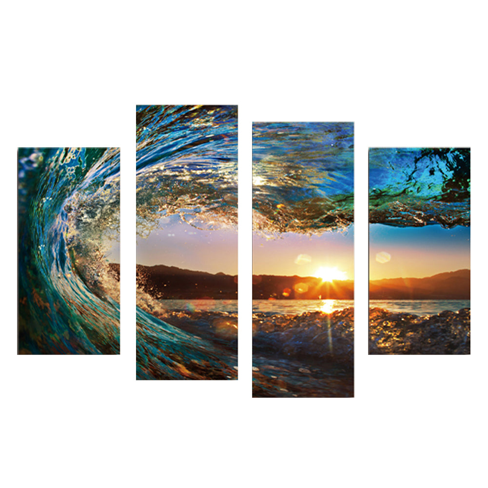 4 Panels Framed Sea wave Scenery Wall Art Pictures Print On Canvas Painting For Home Kitchen Decoration PTSP