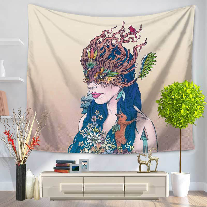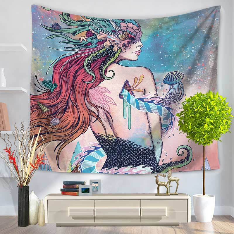 Cartoon Arts Mermaid Printing Hanging, Sandy Beach Sit Carpet Tapestry