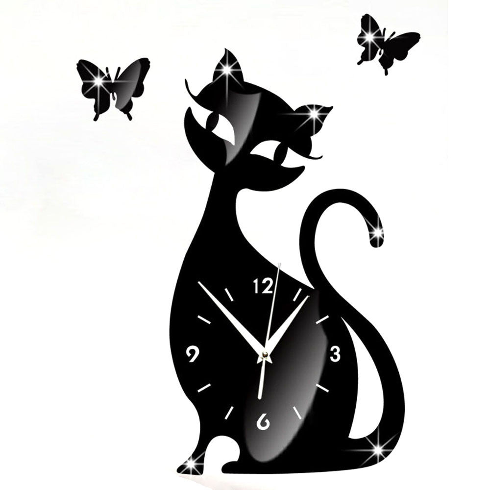 Cute Cat Butterfly Mirror Black Wall Clock Modern Design Home Decor Watch Wall Sticker